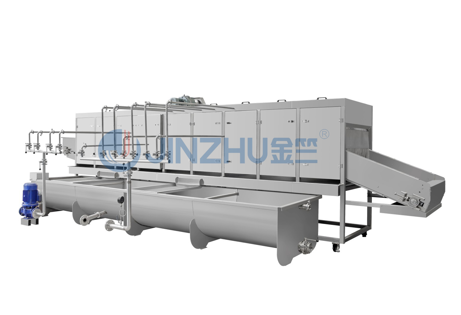噴射式清洗機(預洗段)主要用板于中藥材前處理根莖類藥材清洗作業,通過不銹鋼板鏈輸送帶,將要清洗的物料通過噴射清洗箱體內進行清洗。