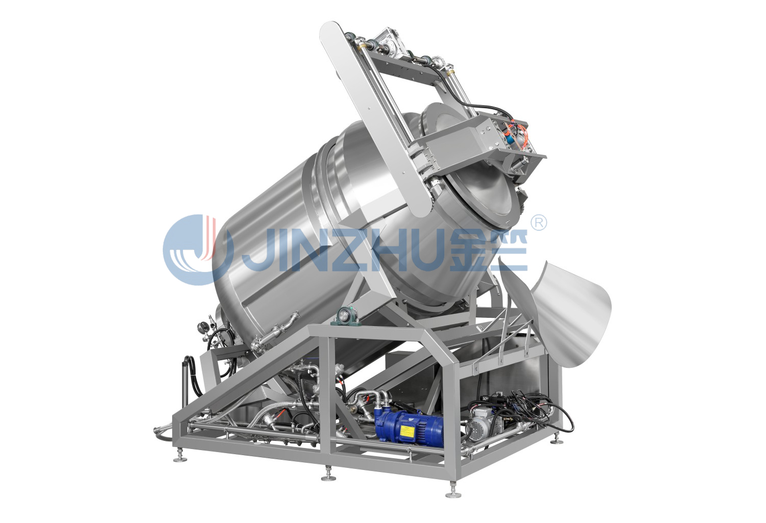 本機由升降式罐門系統、氣動壓門機構、罐體、進水系統、真空系統、排水系統、蒸汽系統、安全閥排氣系統、以及壓力控制系統等構成;罐體在傾斜狀態同時機門處于打開(上升)狀態下,物料采用輸送機輸送進料,輸送進料同時罐體順時針旋轉,裝料完畢,輸送機停止進料并向后退出罐門升降范圍;進料輸送完成。此時,執行進水閥動作進行向罐內注水浸泡藥材,當注水量達到設定流量后,自動停止進水,浸泡工藝過程可在敞開罐門狀態下進行。當浸泡完畢后罐體底部排水閥動作進行排水。浸泡工藝完畢后罐門下降,氣動壓門動作,門充氣密封執行,此時執行潤藥過程,抽真空、蒸汽噴入、潤藥、排氣、排污、罐體升起、開門動作,出料采用輸送機接料。完整的進料、進水浸泡、排水、潤制、出料可自動或手動完成。
